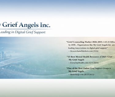 EMERGENCY HELP is available from the SUICIDE LINE at 988 - which is OPEN 24/7 and FREE to all or if you cannot reach them - call 911. ONLY IF YOU ARE NOT EXPERIENCING ANY SUICIDAL THOUGHTS; including those of hurting yourself or others, and have the approval of your mental health professional to participate in open free virtual peer-led grief support groups, ONLY THEN, please join us. My Grief Angels is a 100% volunteer-created,developed and managed public non-profit for & by people grieving. All shared grief journeys and stories in this site are by real people grieving, and in some cases "AI Grief Avatars/Griefatars" are used to read and further highlight some of the incredibly powerful real-life shared stories. The support and information provided by all the volunteers in the peer-led virtual grief support groups, online chats - grief chat hours and other free online services are for general informational purposes and are not a substitute for professional mental health advice, diagnosis, or treatment - always consult your own mental health professional prior to joining any peer-led grief support group, online grief chat community or any other peer-led grief support services. Volunteers are not licensed therapists, counselors, or any other type of mental health professional - they are people grieving like yourself and volunteering their time to simply share their own grief journey and be present for others grieving or anticipating the death of a loved one. Therapy, diagnosis of conditions, and prescription of treatments are NOT offered. Always consult with a qualified mental health professional for any concerns about mental health or well-being. Please always consult your mental health professionals on whether free open virtual peer-led grief support groups are appropriate for you - as they are not appropriate for everyone.